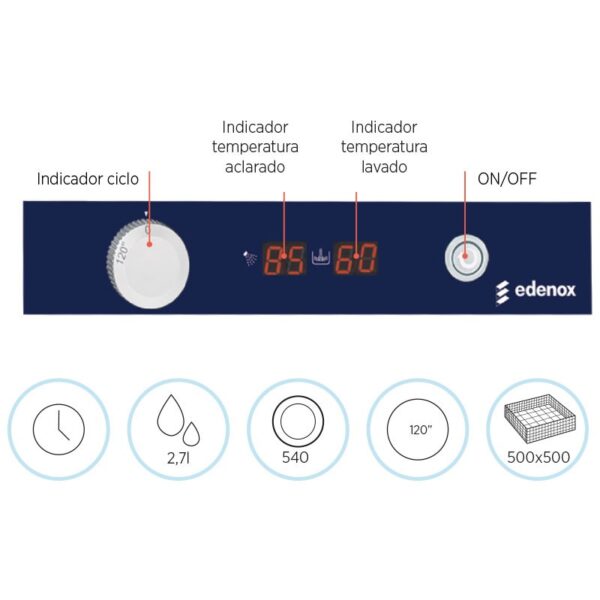 - Potencia de la cuba de lavado: 2,8 kW. Capacidad: 25l.