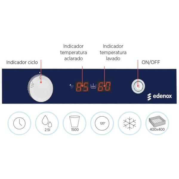 - Programador electromecánico. Incluye indicador de ciclo, indicador de temperatura de aclarado, indicador de temperatura lavado y pulsador ON/OFF.